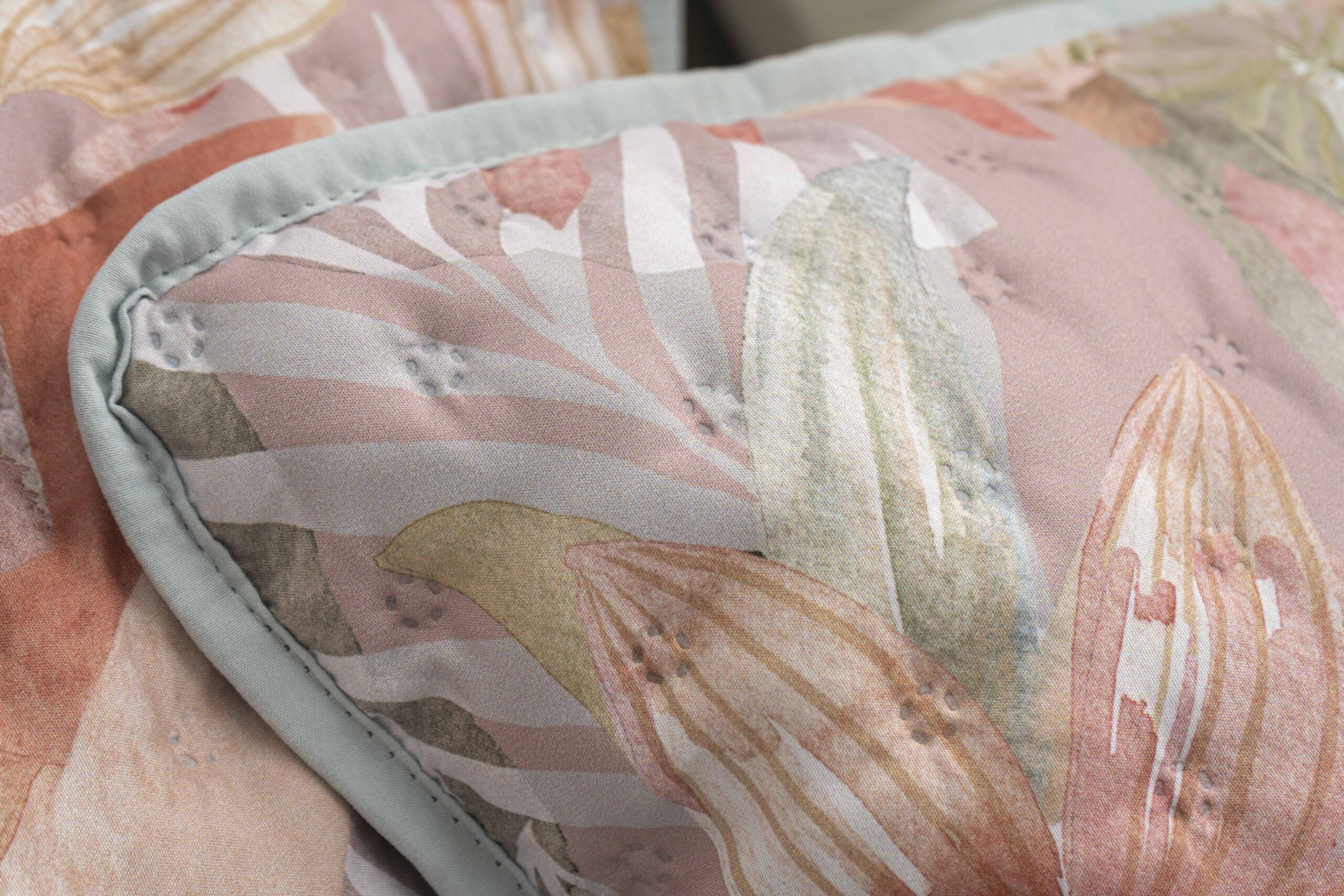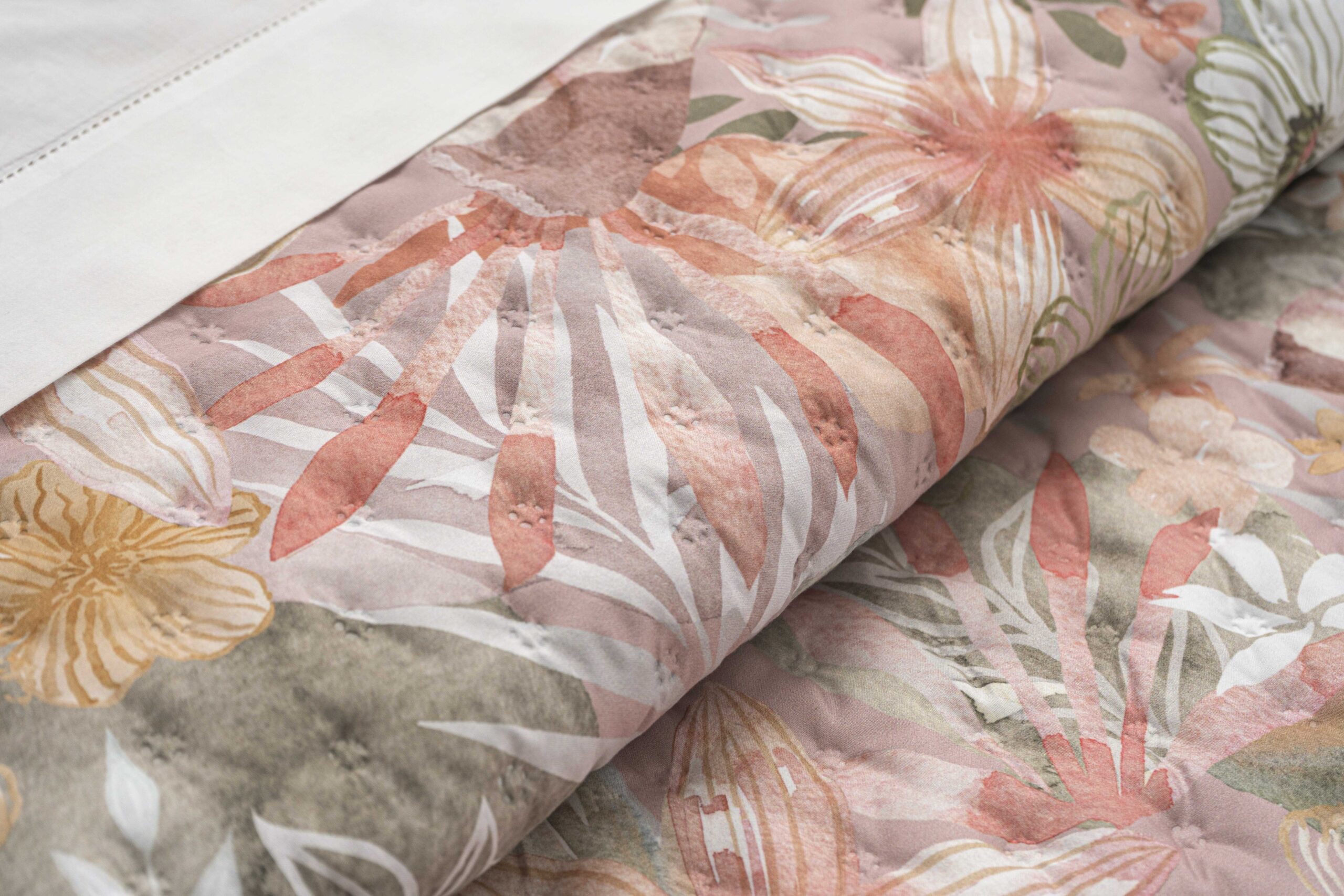 Colcha acolchoada com padrão floral exuberante, inspirada na natureza e nas cores quentes do verão. A combinação de tons coral, verde suave e apontamentos neutros cria um ambiente alegre e sofisticado, tornando a cama o elemento central do quarto.