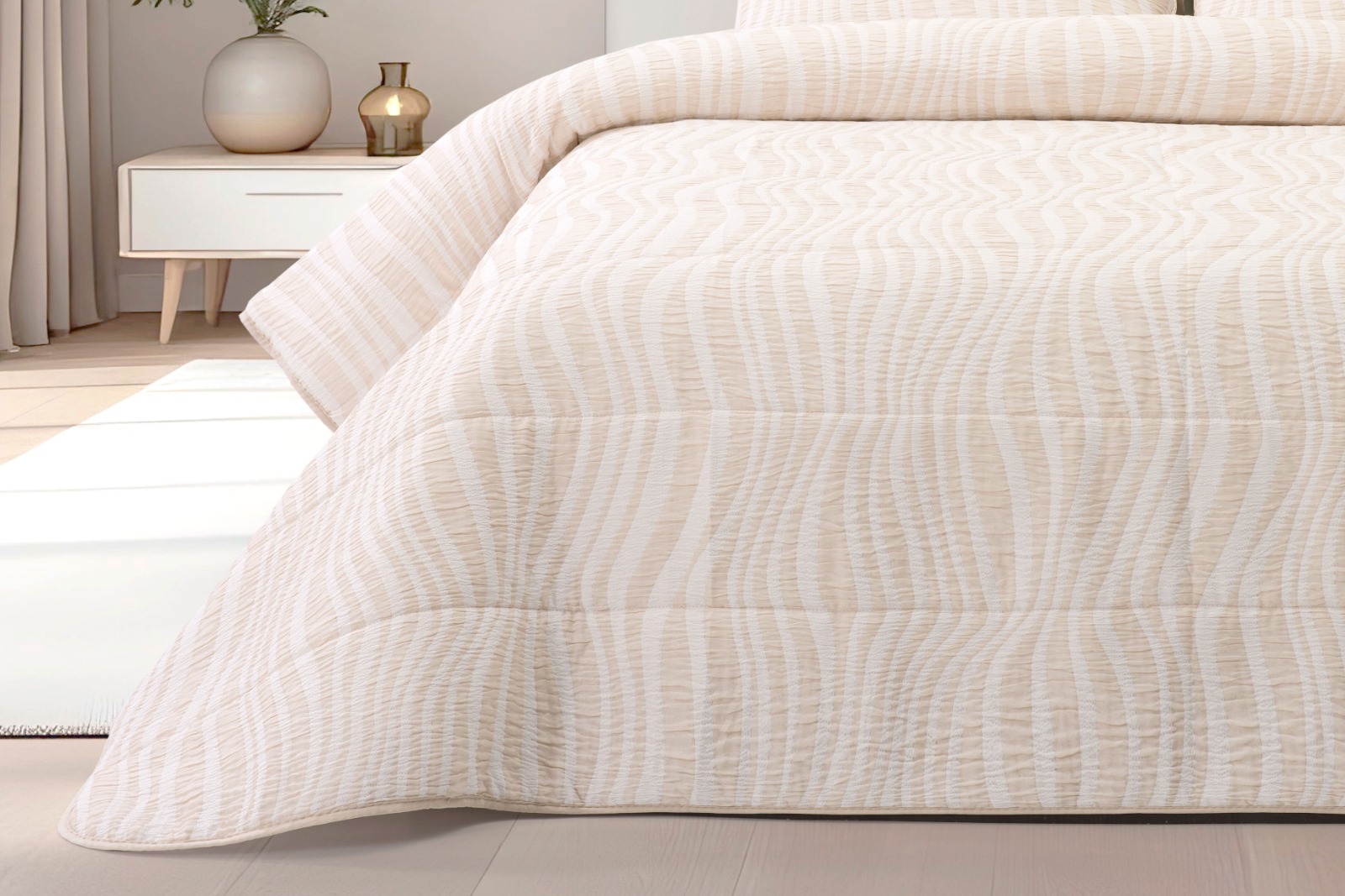 A Colcha BAMBU combina um design contemporâneo com um toque suave e aconchegante, ideal para transformar o quarto num espaço harmonioso e acolhedor. Confeccionada em tecido jacquard stonewash , apresenta um padrão subtil em relevo que acrescenta profundidade e requinte à decoração.