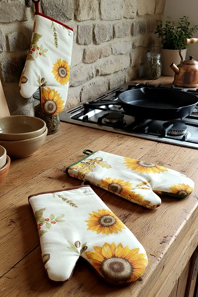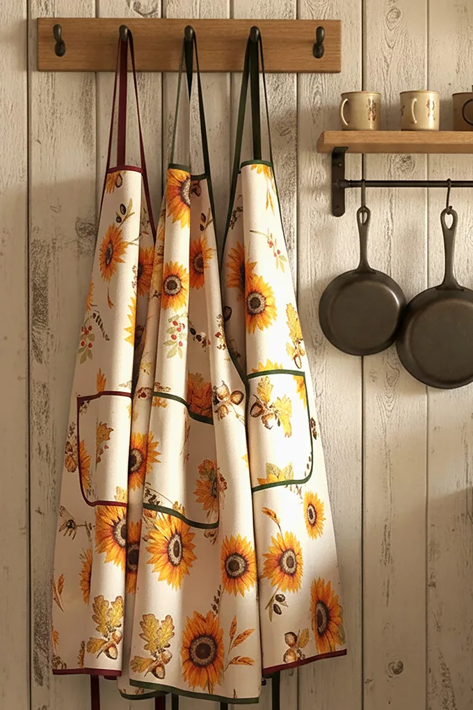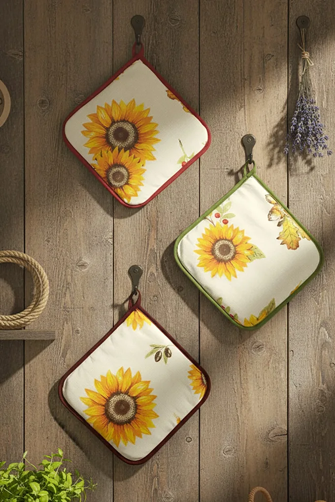 Dê um toque autêntico à sua cozinha com este encantador conjunto Girassol. Composto por avental, pega e luva de forno, todos decorados com Girassóis. Fabricado em tecido resistente, é ideal tanto para uso diário.
